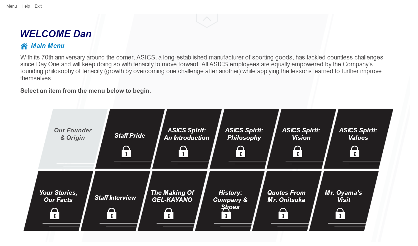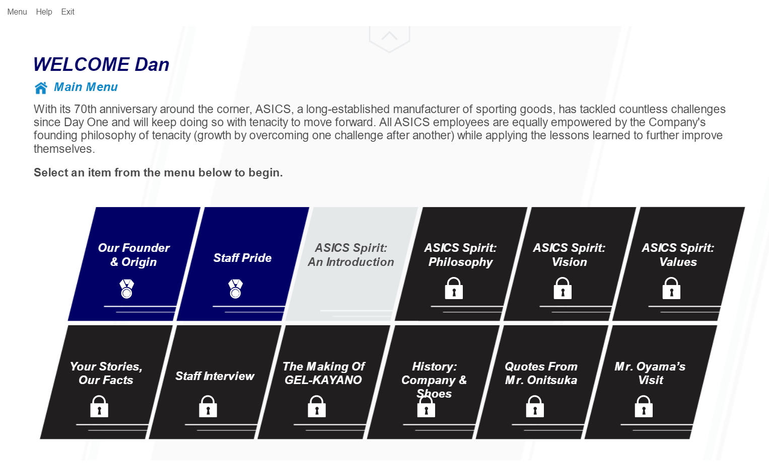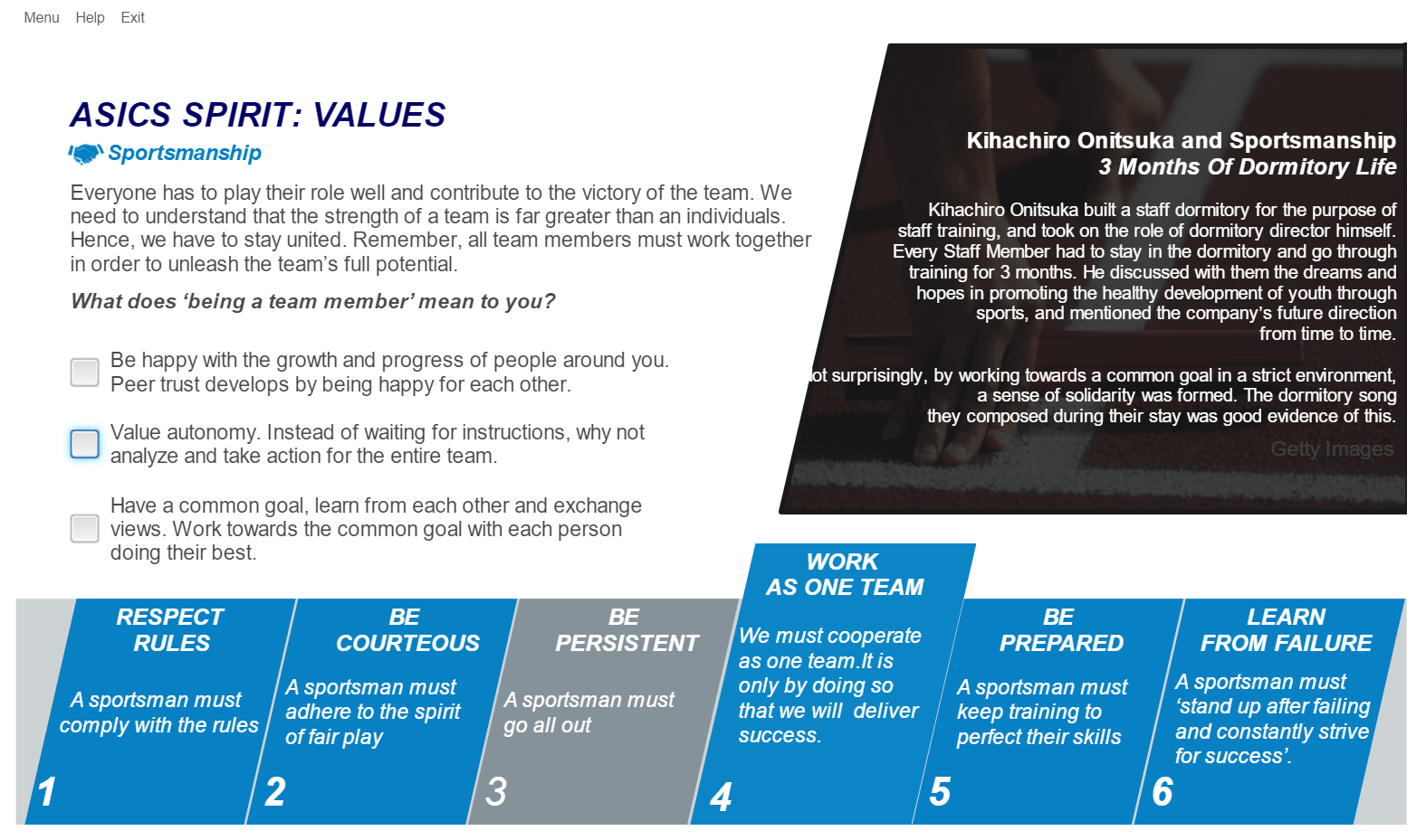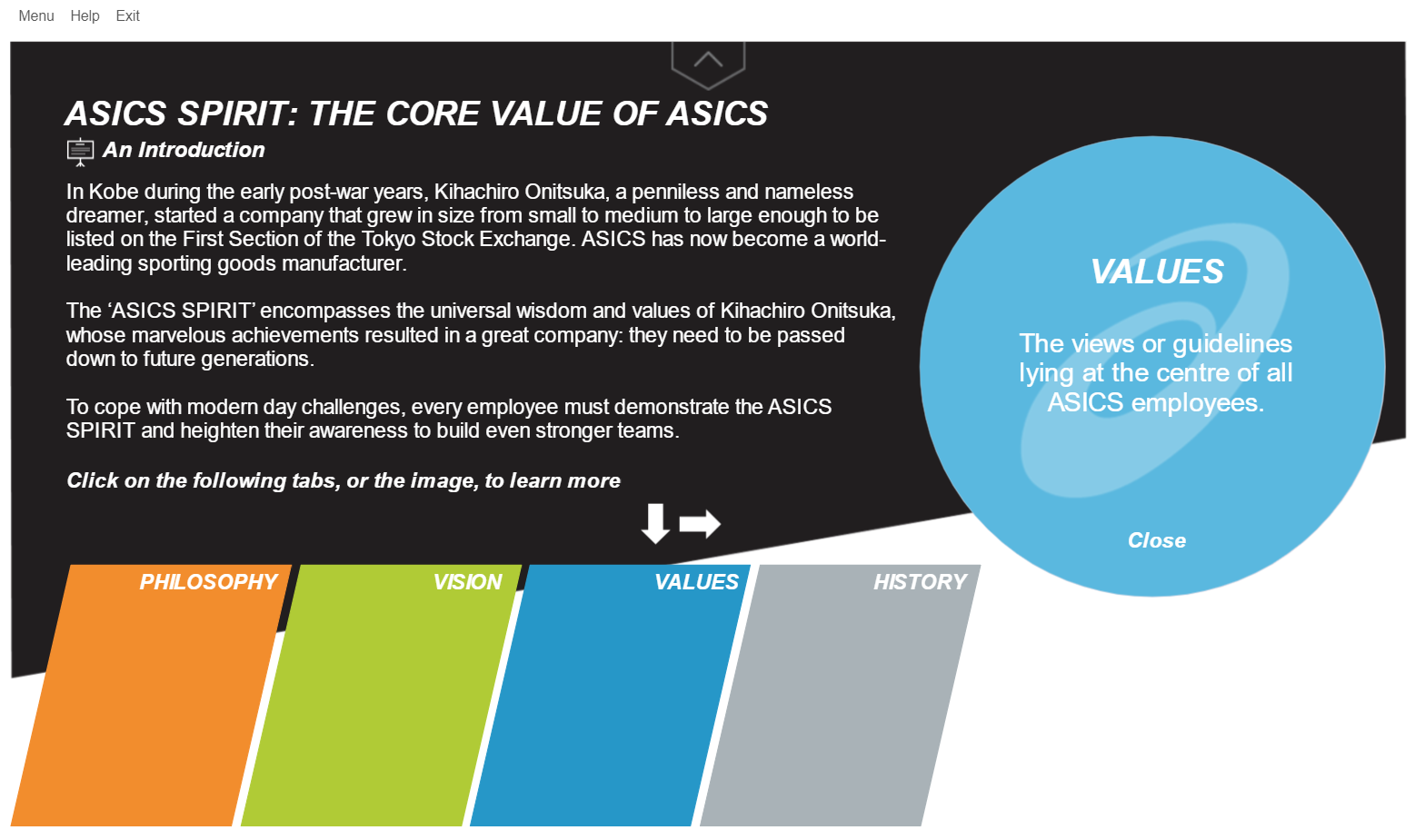 ASICS commissioned an interactive eLearning module to support the onboarding of new employees worldwide. The experience introduces the brand’s origins, charts its most significant milestones, and explores the values that continue to shape ASICS today. Designed to be informative and engaging, the module helps new team members connect with the company’s culture while gaining a clear understanding of its heritage and achievements.