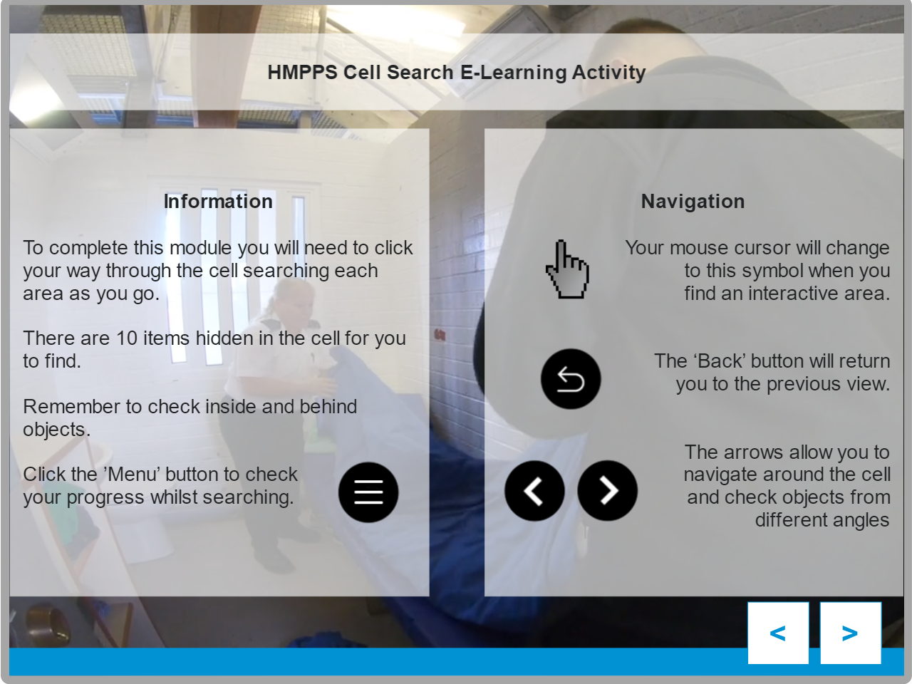 HMPPS required an interactive training application to support new staff in learning effective cell search procedures. The solution used realistic, hands-on simulations to allow users to practice identifying contraband within a controlled environment. This approach helped staff build procedural confidence before carrying out searches in real operational settings.