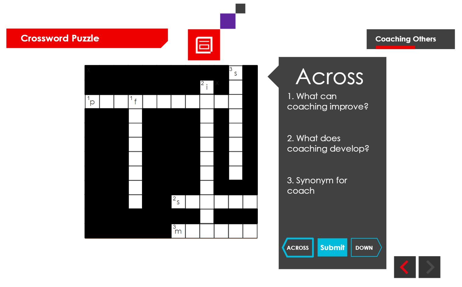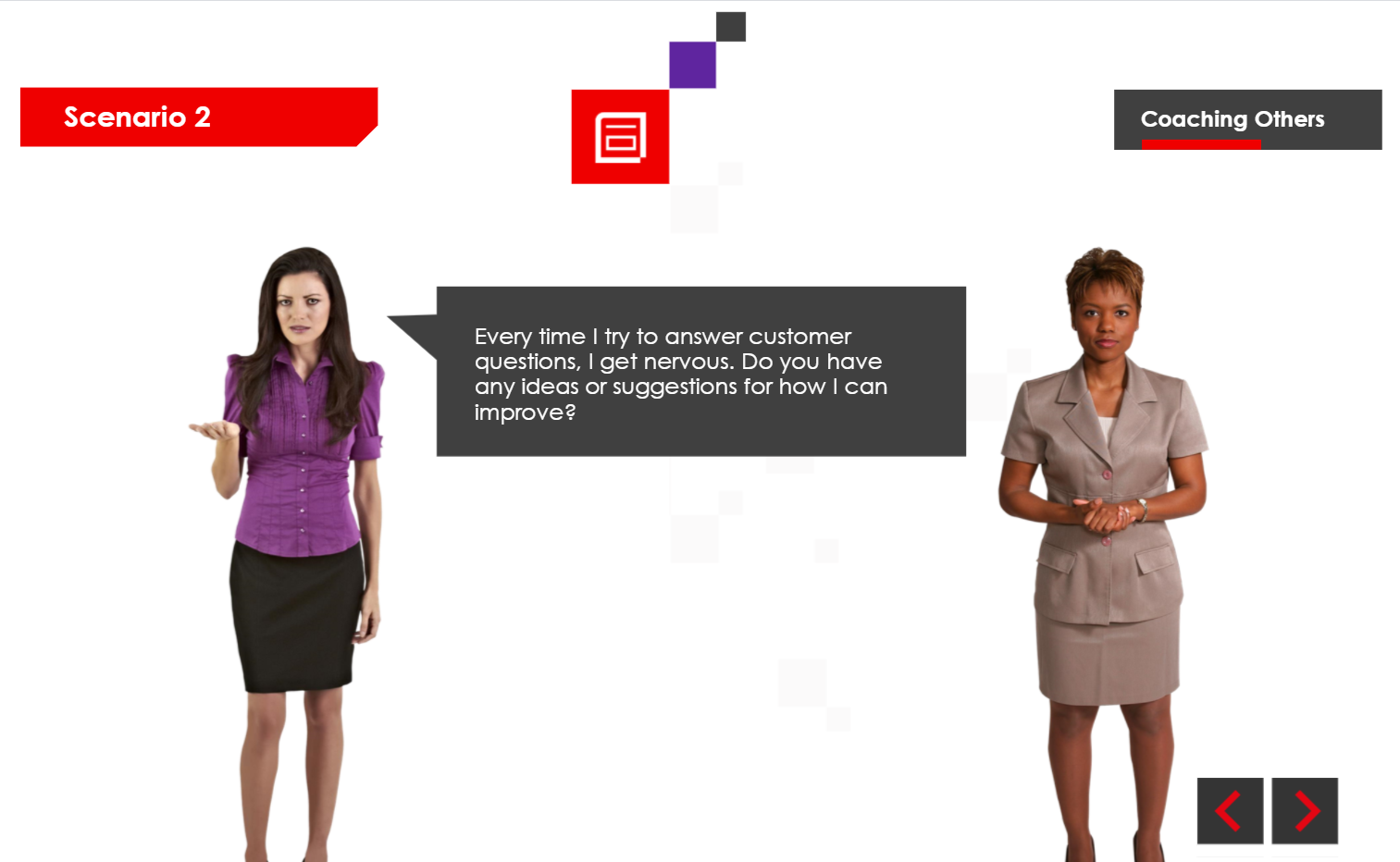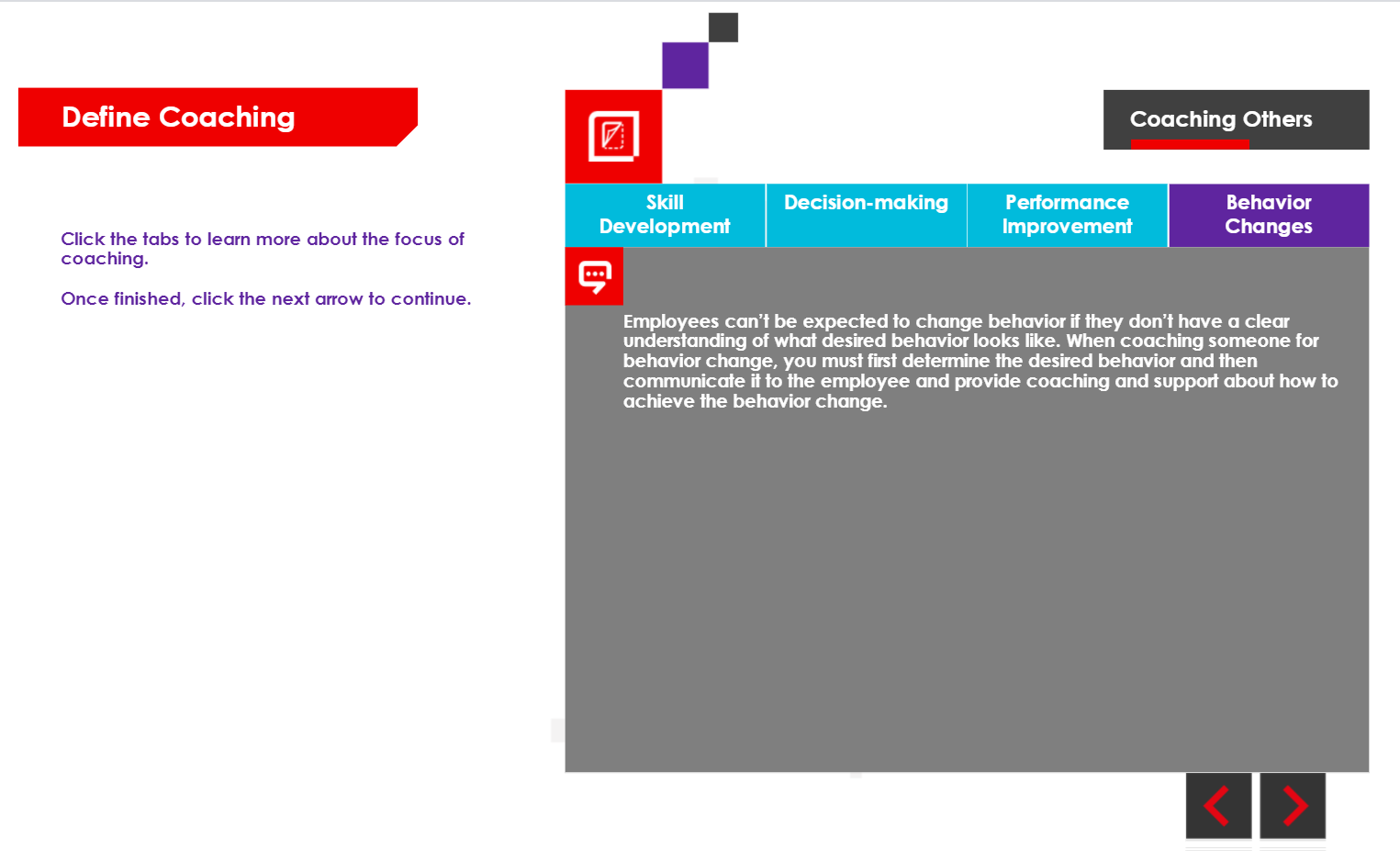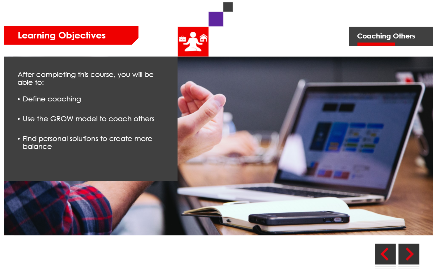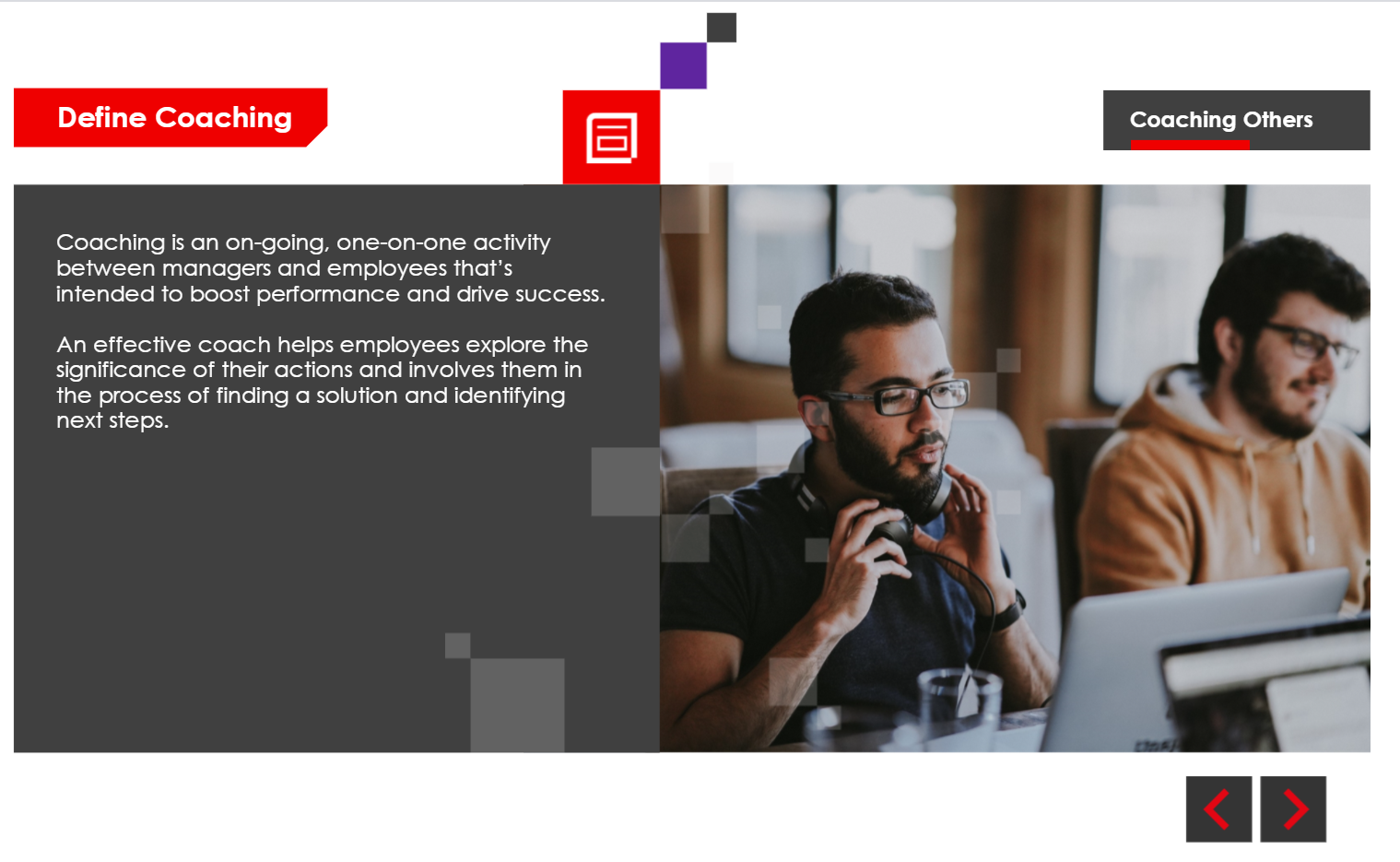 This module was created as part of a broader suite of mental health and wellbeing applications for RS Components. Each application focused on a specific wellbeing theme, with this module exploring coaching others through supportive and practical techniques. The content aimed to promote healthier workplace interactions and improve employee wellbeing.